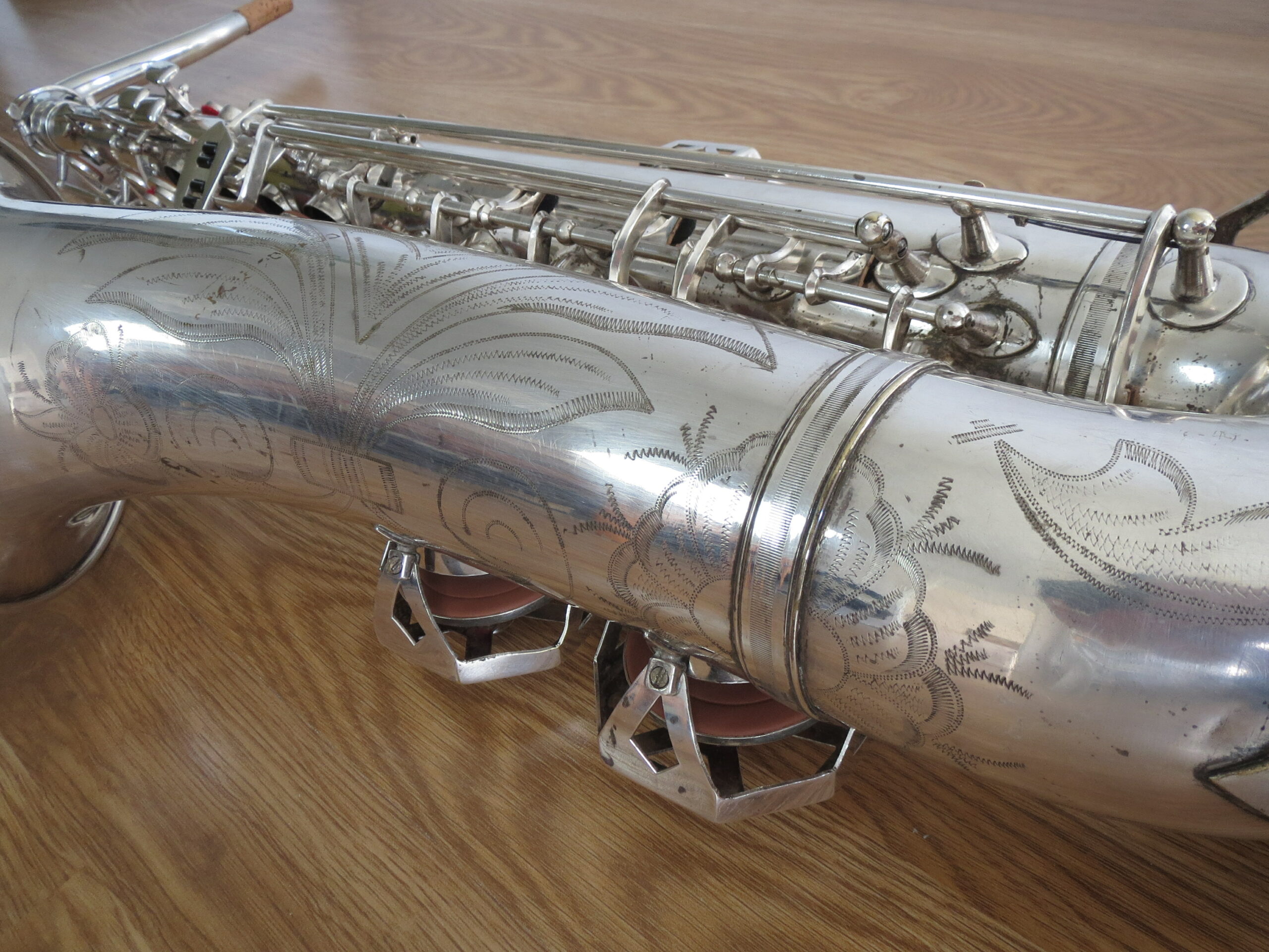 Fransk saxofon i gott skick. Det mesta av silverpläteringen är kvar.